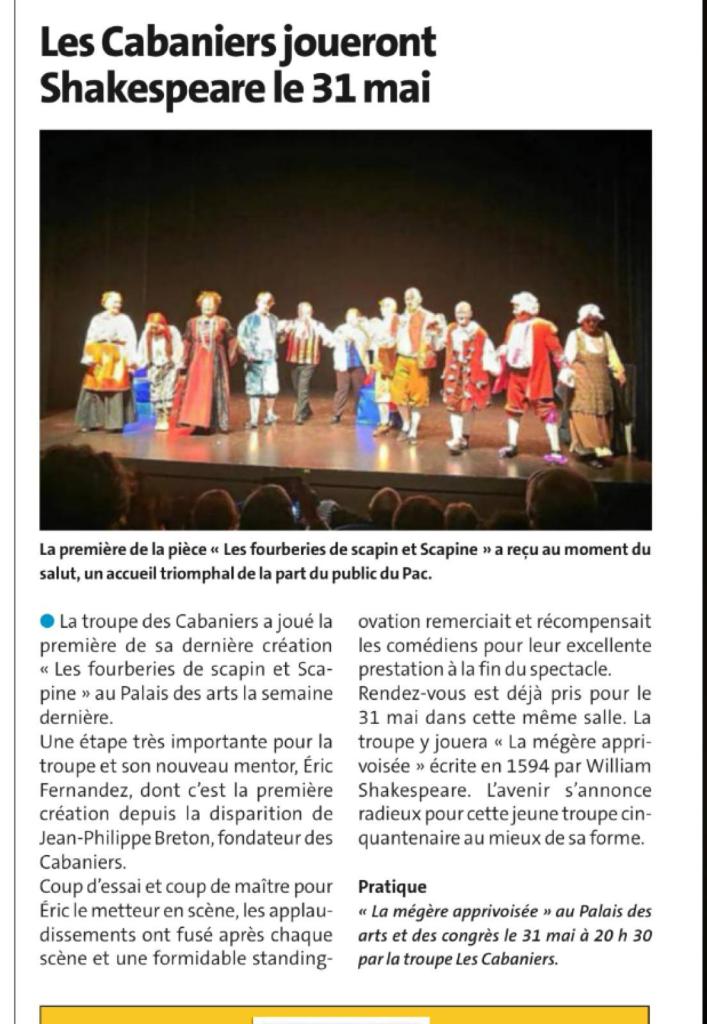 Après « Les Fourberies de Scapin et Scapine », les Cabaniers joueront Shakespeare à Vannes le 31 mai